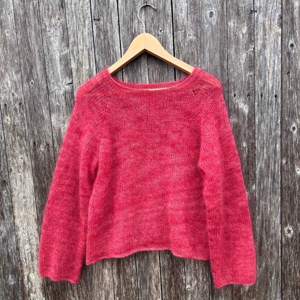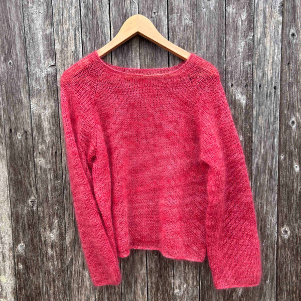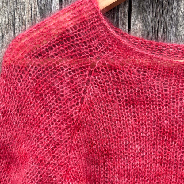 Klassisk modell i glattstrikk av mohairgarn. Mohairgarnet er uten spenst og ligger flatt uten å rulle ved opplegg og felling.